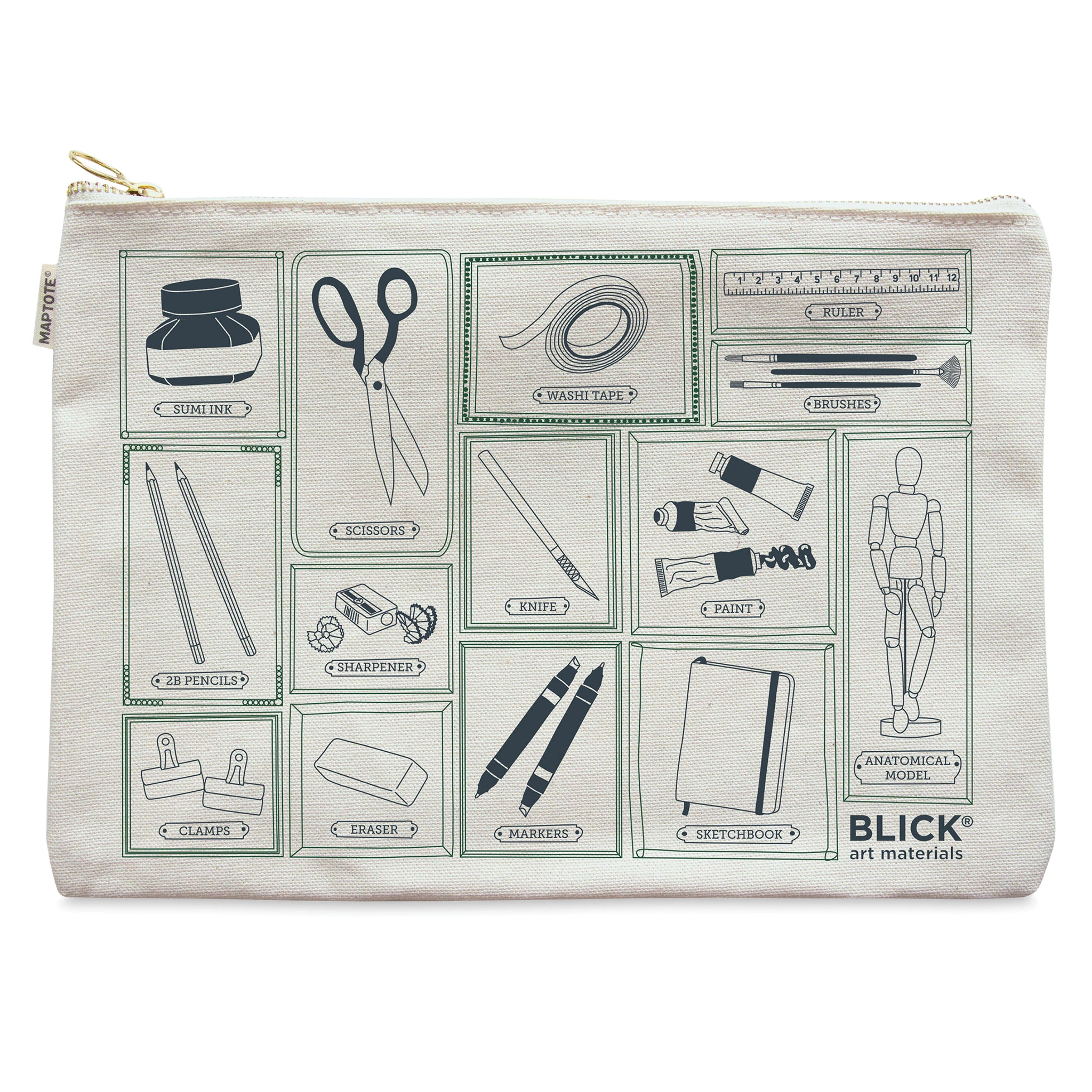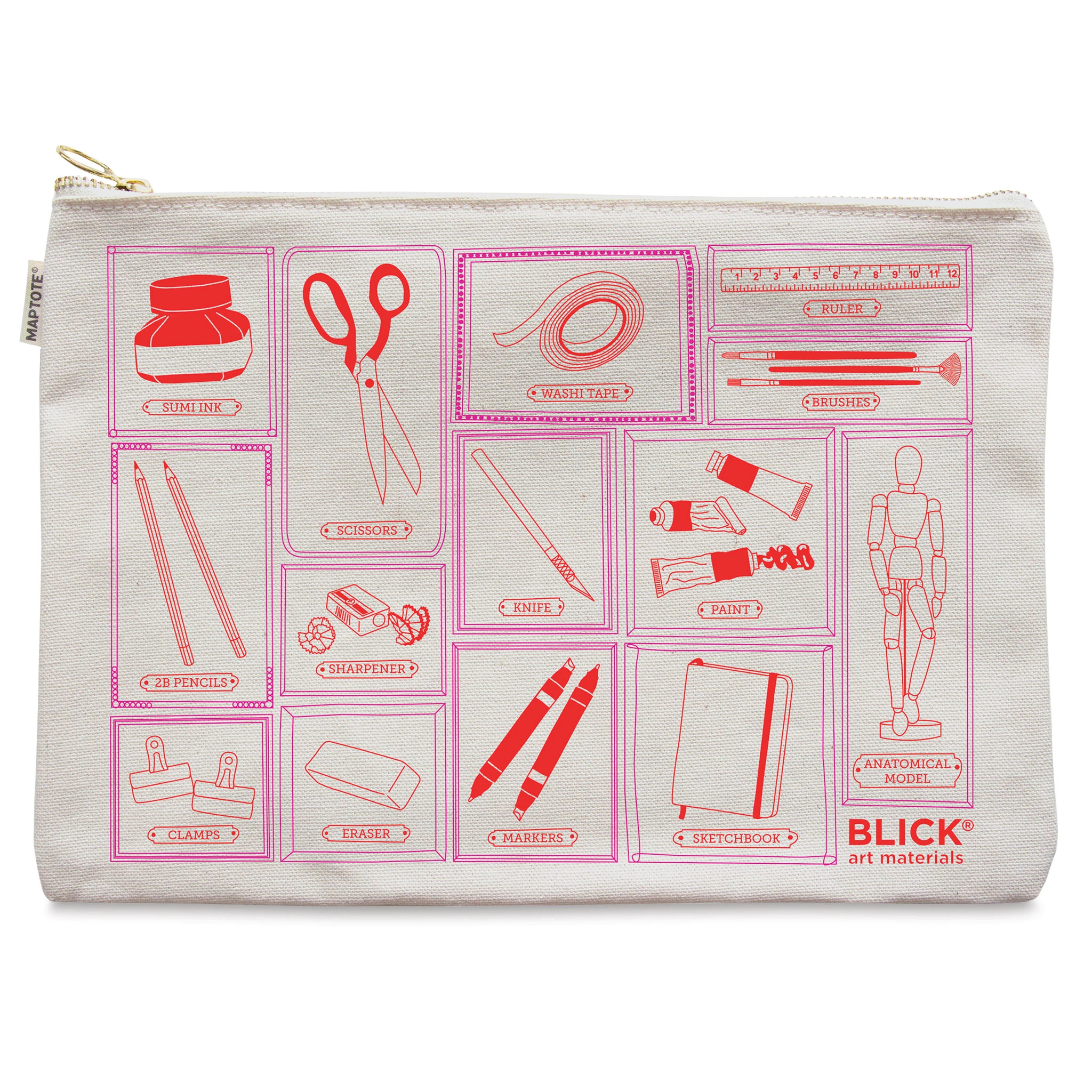 Gift the artist or creator in your life with a travel pouch showcasing their favorite supplies with the Blick Flat Zip Pouch by Maptote! These versatile totes fit a standard tablet and can be used to store art supplies, documents, and more. Designed and locally hand silk-screened in Brooklyn, NY, th…
