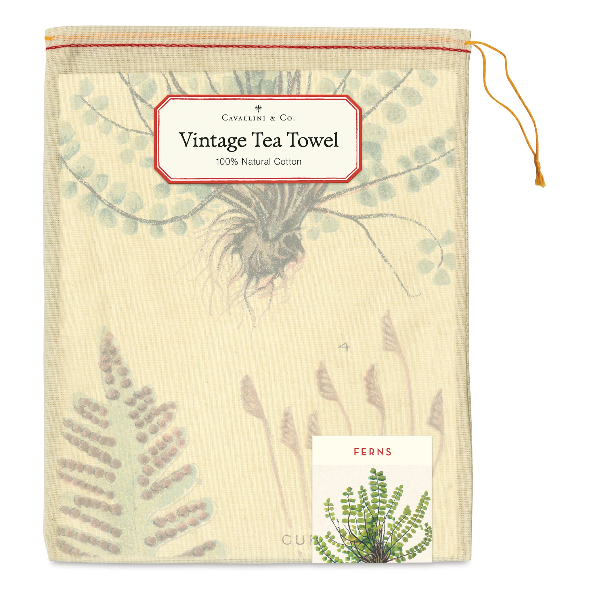 Breathe new life into your kitchen décor with the Cavallini Ferns Tea Towel. Featuring vintage illustrations from Cavallini’s archives, this soft and absorbent 100% natural cotton towel can be used for cleaning or decorating your kitchen. It has a cotton twill loop for easy hanging and comes in a ha…