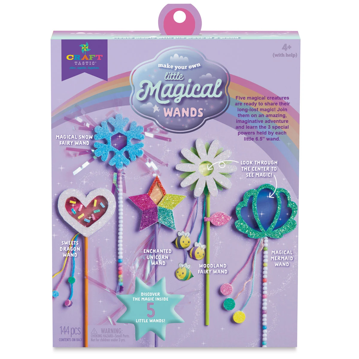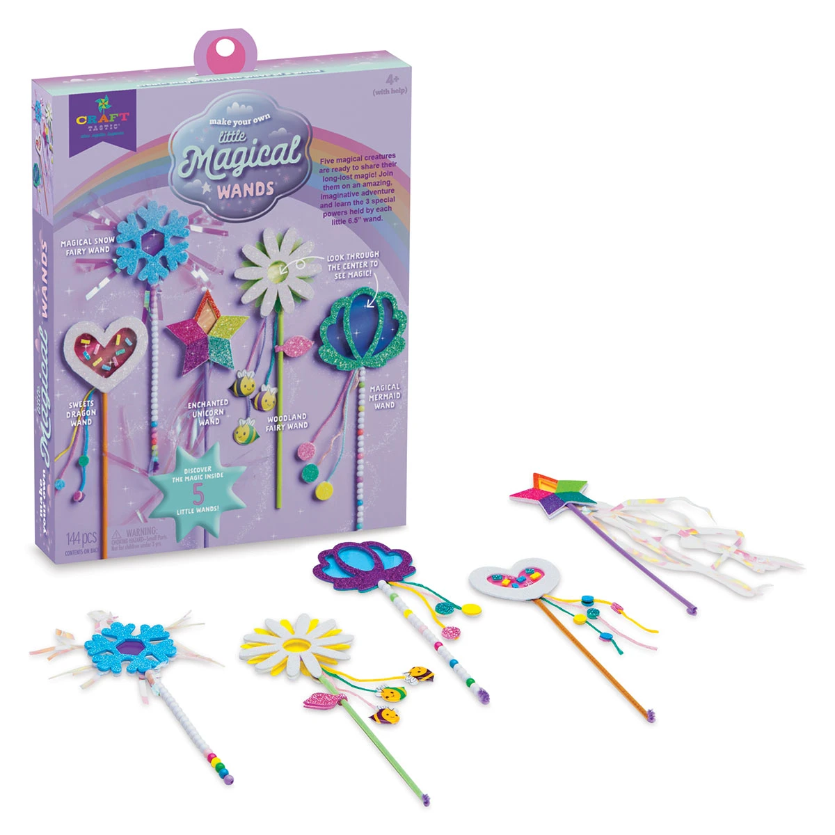 Delight and engage kids’ imaginations with the Craft-tastic Make Your Own Little Magical Wands Kit. This kit contains all the supplies and instructions needed to craft five dazzling and colorful wands inspired by five magical creatures, including unicorns, dragons, and fairies. Each finished wand me…