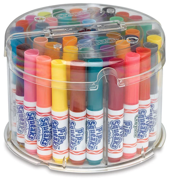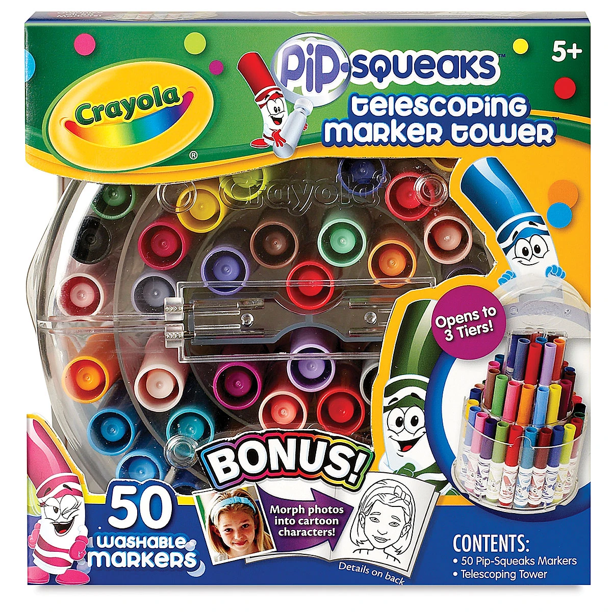 The telescoping, tiered effect of this tower allows children to easily access any one of the array of 50 brightly colored markers. Small in size for kids’ little hands, but big in color! Pip-Squeaks are a shorter version of the full-size line of Crayola washable markers.