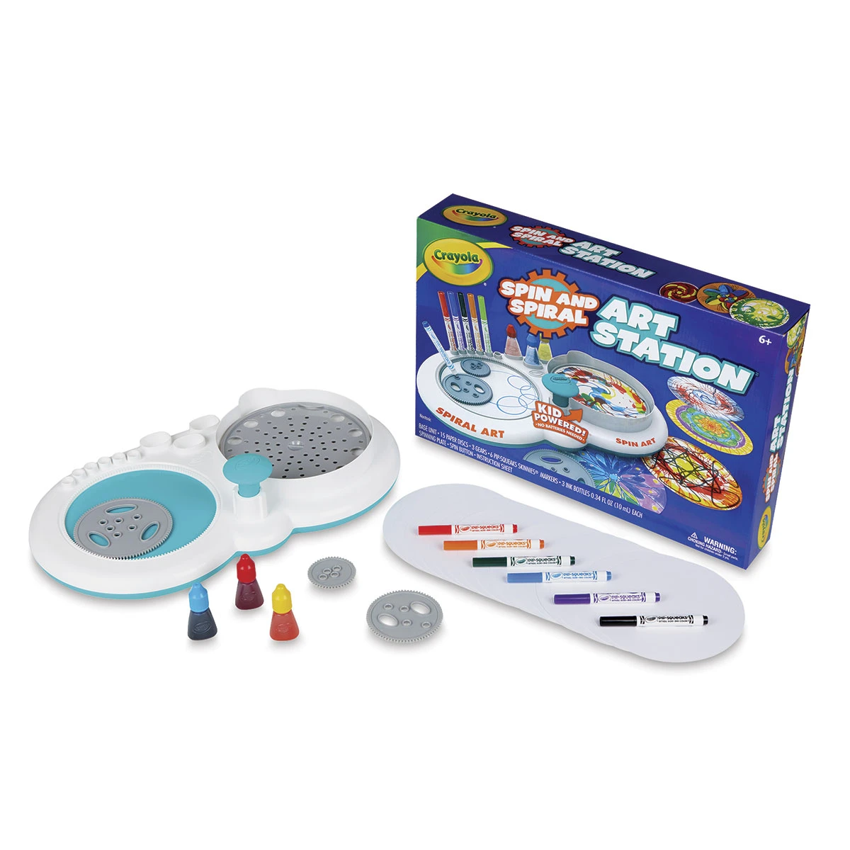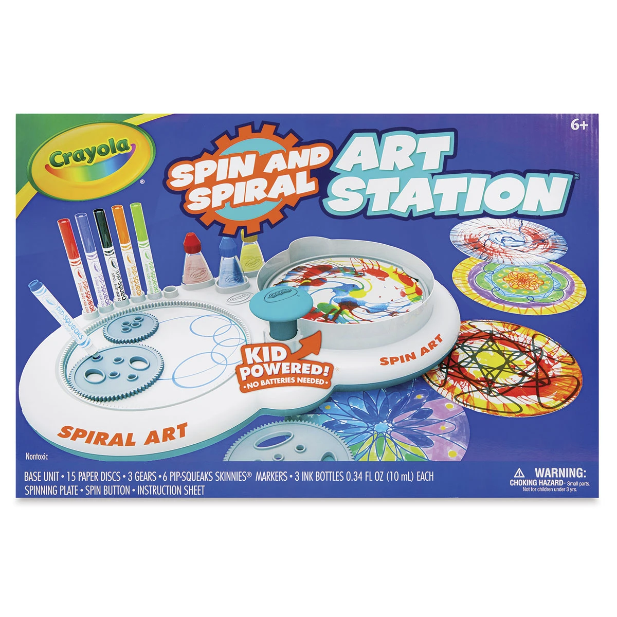 Create spiraling and geometric works of art with the Crayola Spin and Spiral Art Station. This two-in-one activity features two sides — one with gears for creating circular marker designs, and the other for dripping spin art paintings.