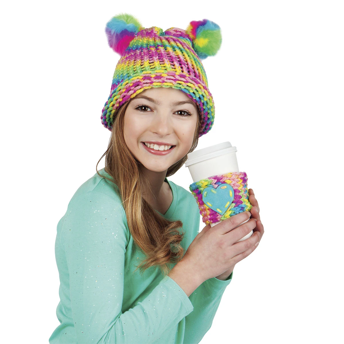 Introduce aspiring textile artists to knitting with the Creativity for Kids Quick Knit Loom Kit. It includes everything you need to create one pom pom hat and a cup cozy. No prior skills are required.