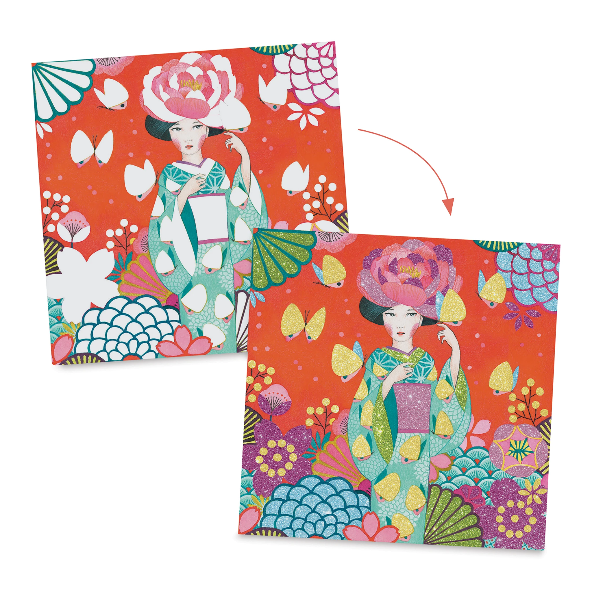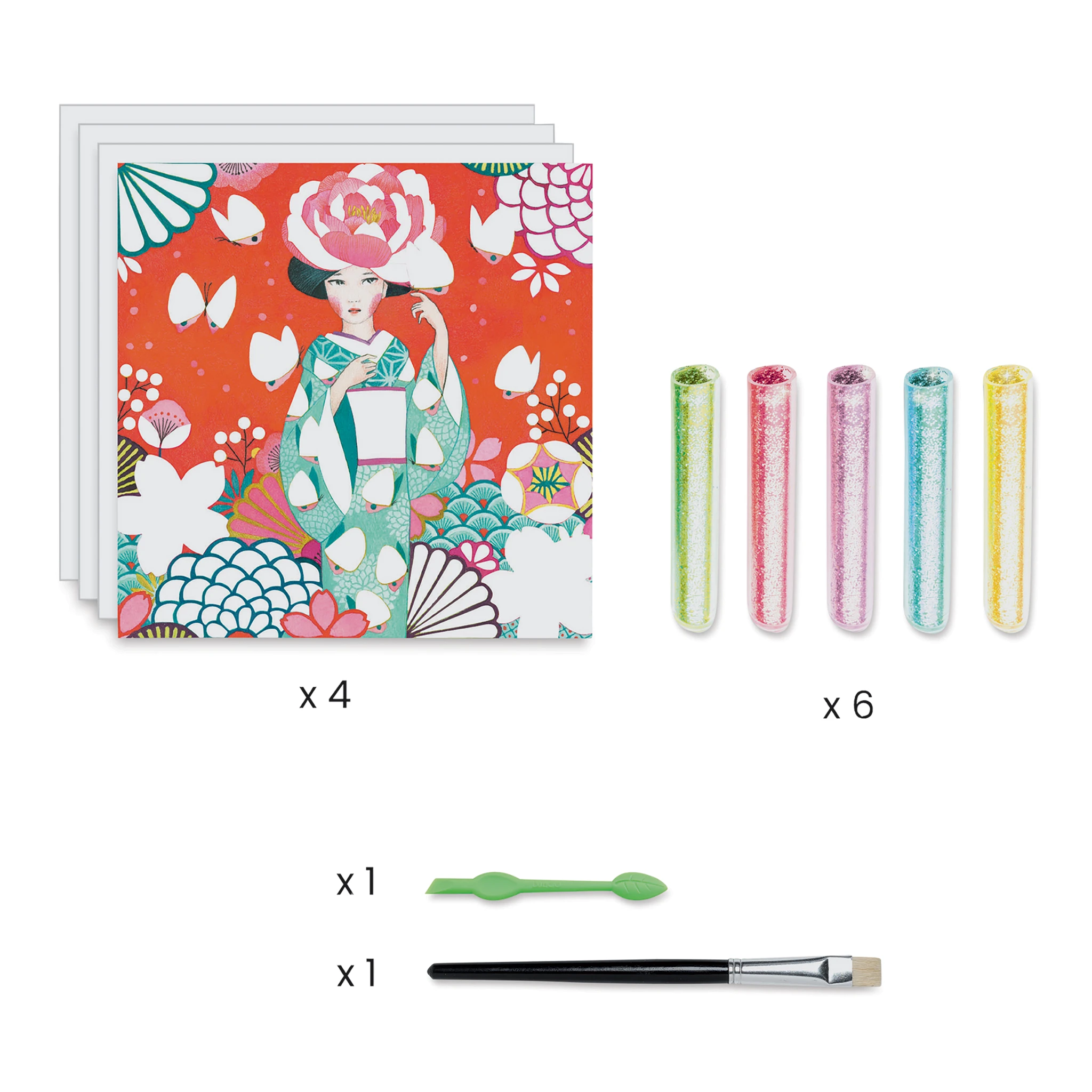 Create glittering works of art with Djeco Glitter Board Kits. Each kit includes four partially illustrated boards to complete, six glitter tubes, one tool, one brush, and a step-by-step instruction booklet, all packaged in a beautiful box with an elastic strap for on-the-go creating. Create your pro…