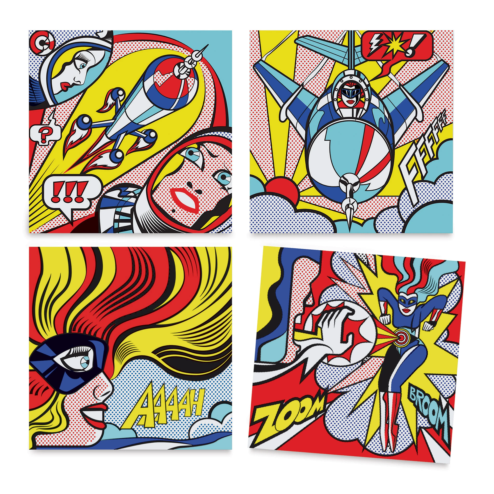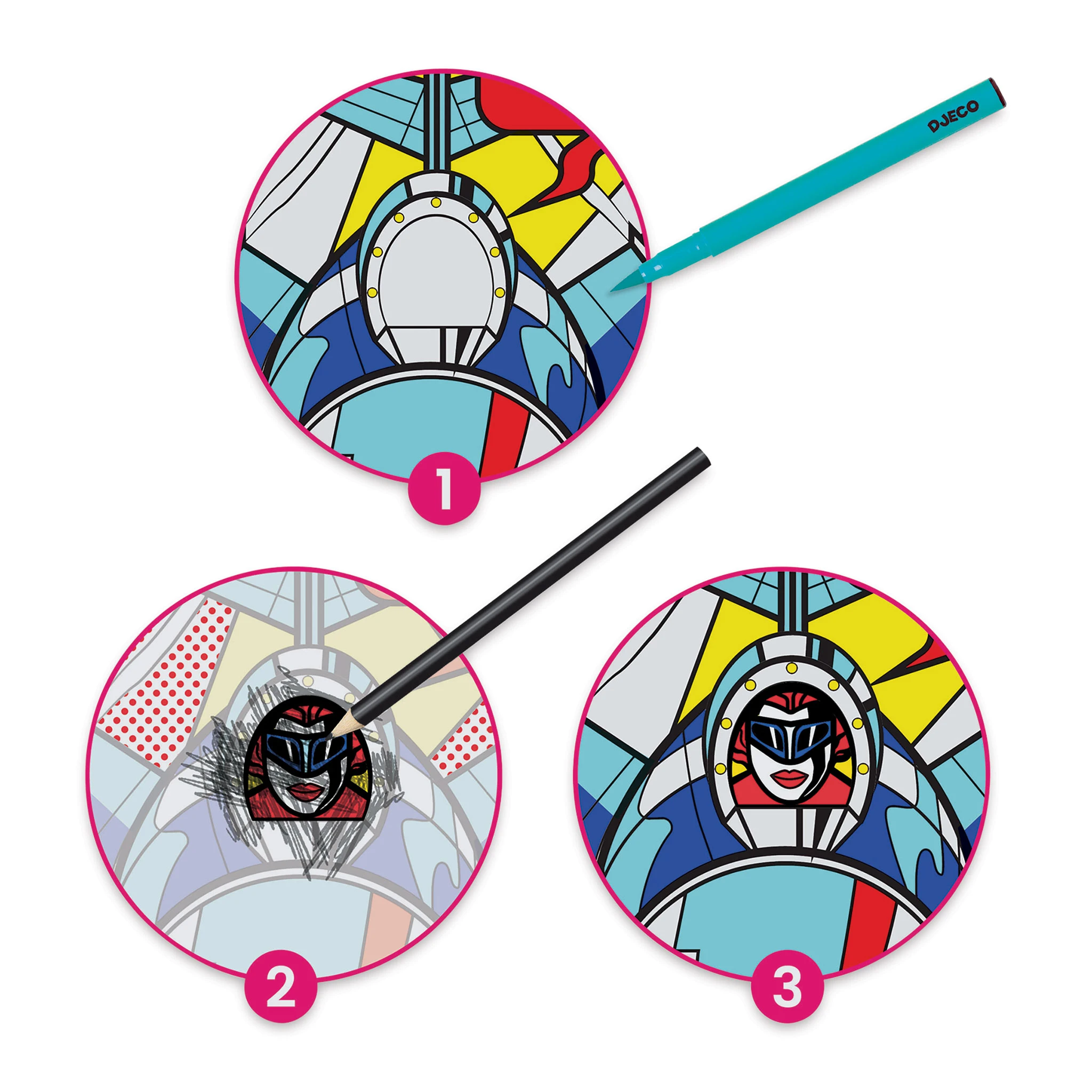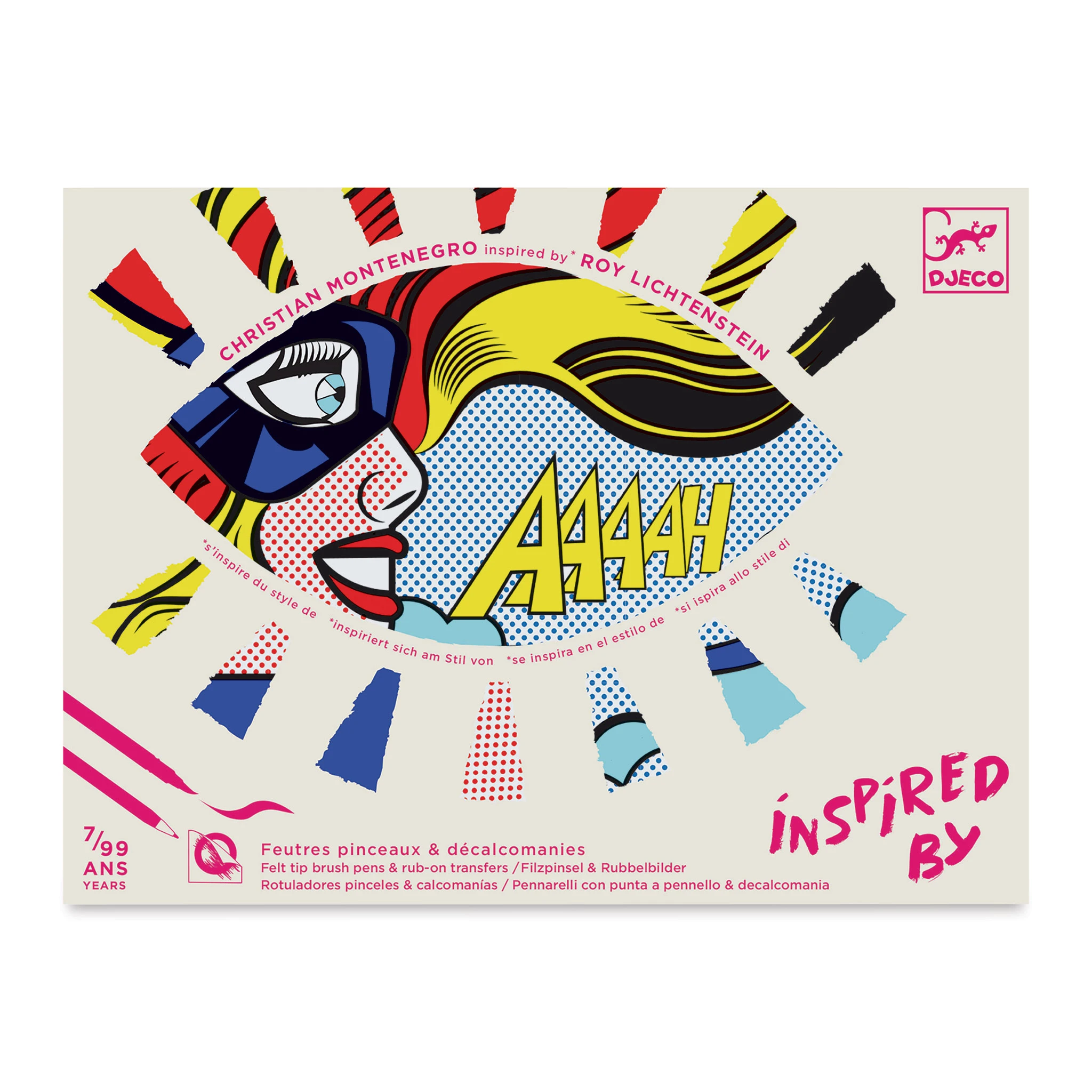 Delve into the work of American Pop Artist Roy Lichtenstein with the Djeco Inspired By Superheroes Felt Tips and Rub-On Transfers Kit, designed by Christian Montenegro. First, color the boards using the markers and then use the transfer cards to add details like polka dots to make the images resembl…