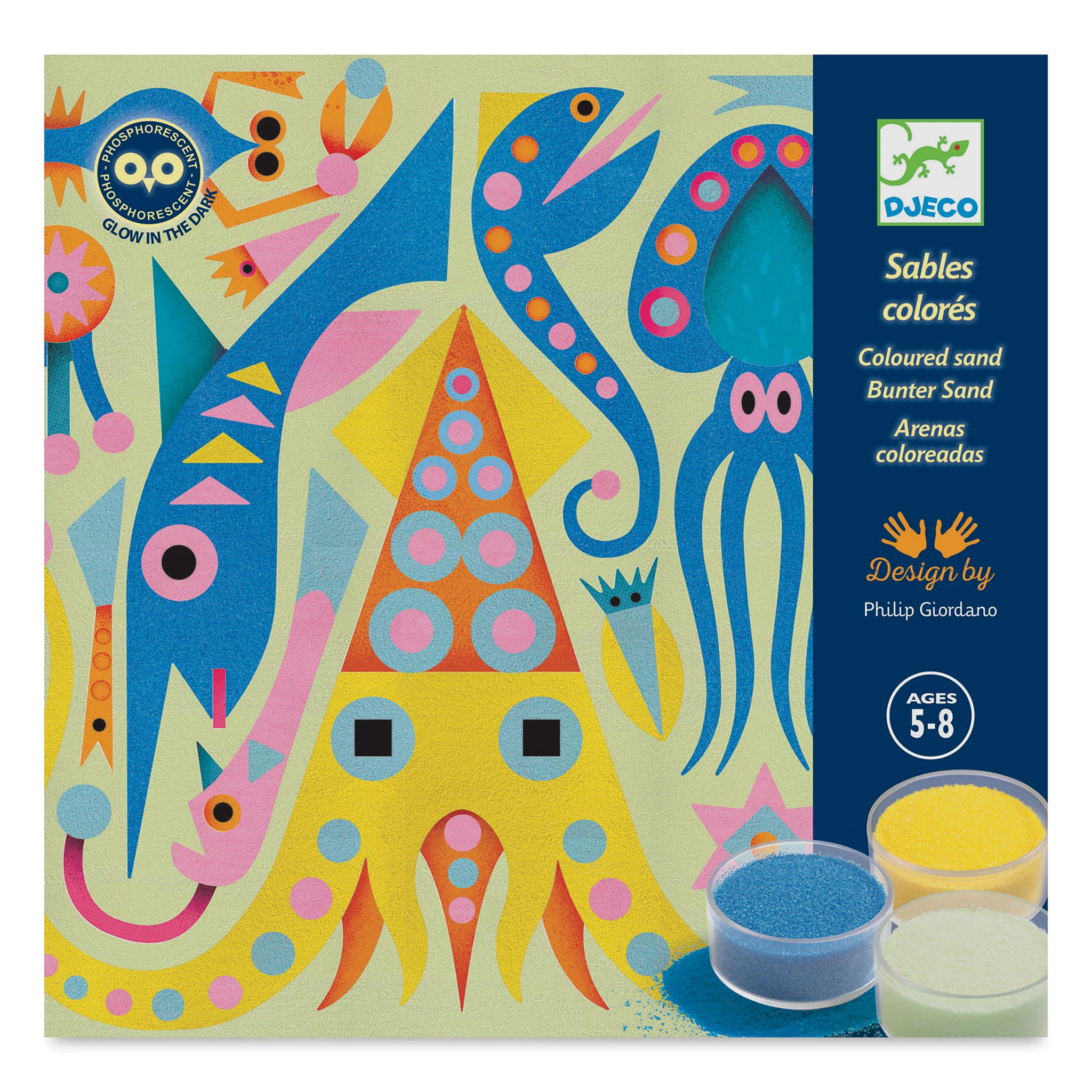 Create super cool sand art that glows in the dark with the Djeco Le Grand Artist Glow in the Dark Sands Kits. Using the specially designed tool, peel away the protective paper to reveal the pre-glued areas and use the number key to add the correct color of sand to each section. Kids can work on thei…