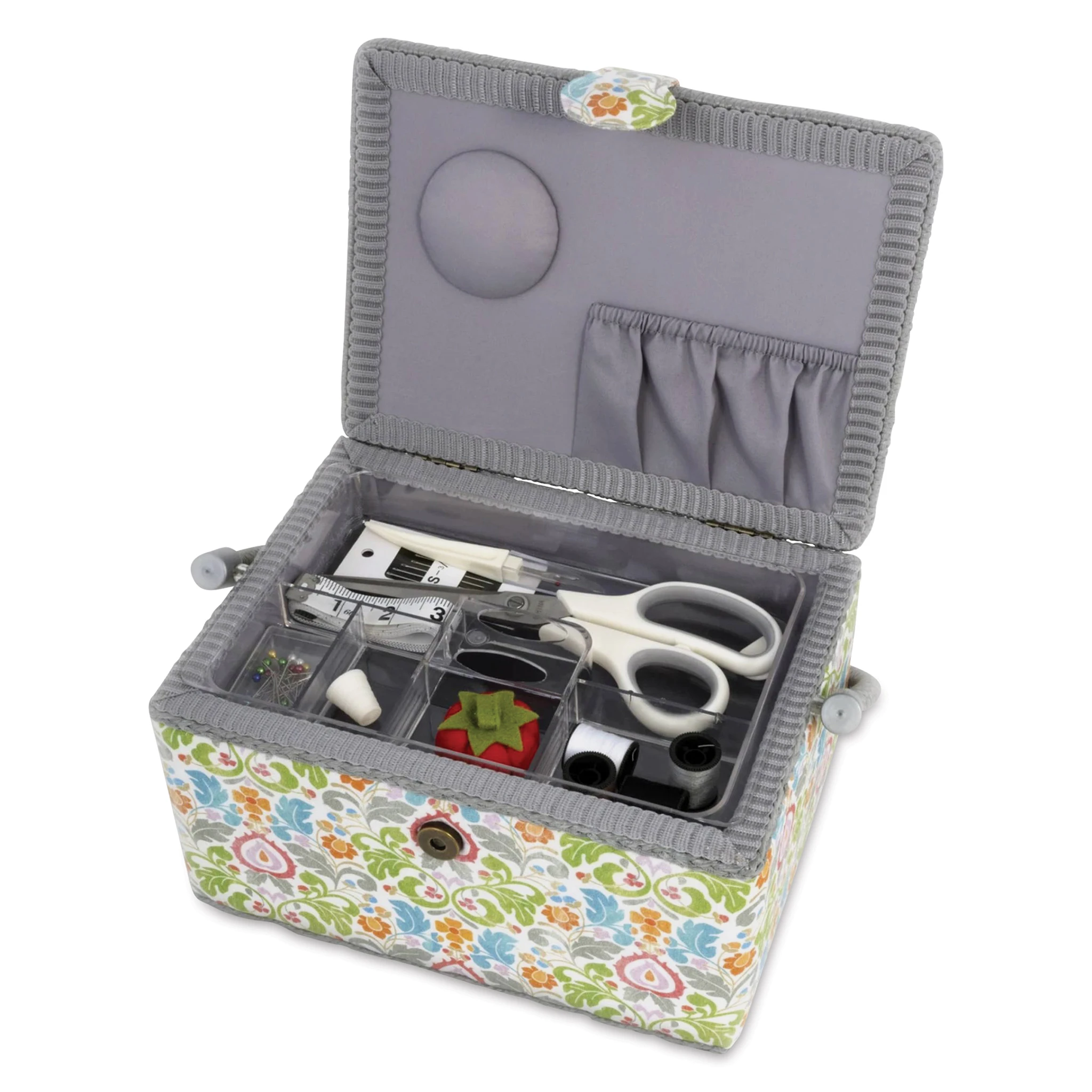 Keep all your essential sewing supplies in one handy place at home or on the go with the Dritz Essential Sewing Basket Kit. This fashionable and functional basket has a floral design and a coordinating cord-wrapped handle and trim and features a removable tray for organizing the included sewing supp…