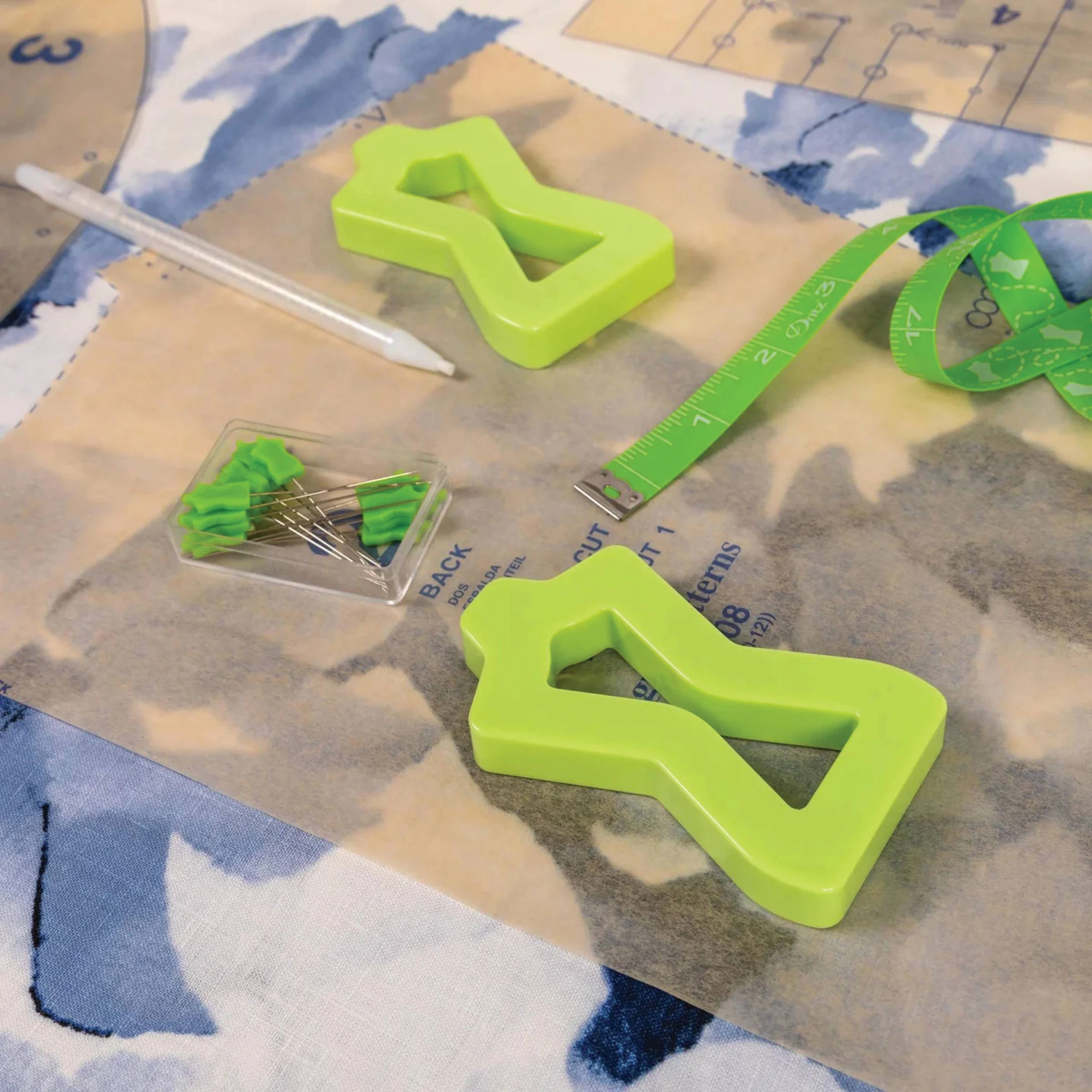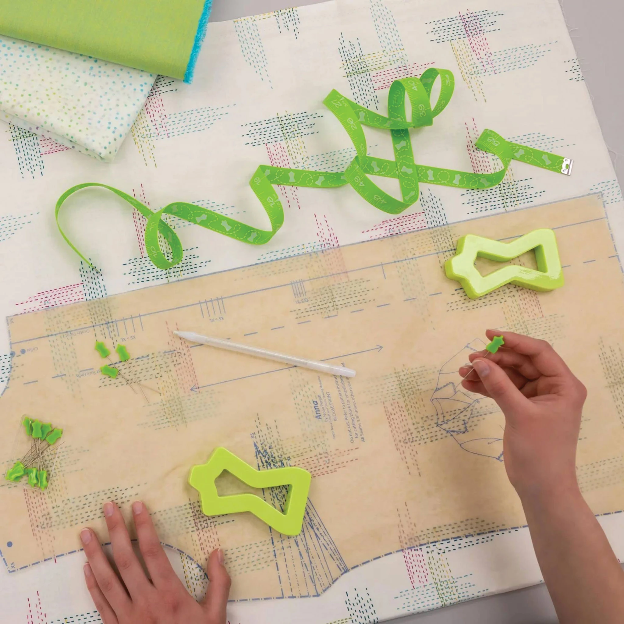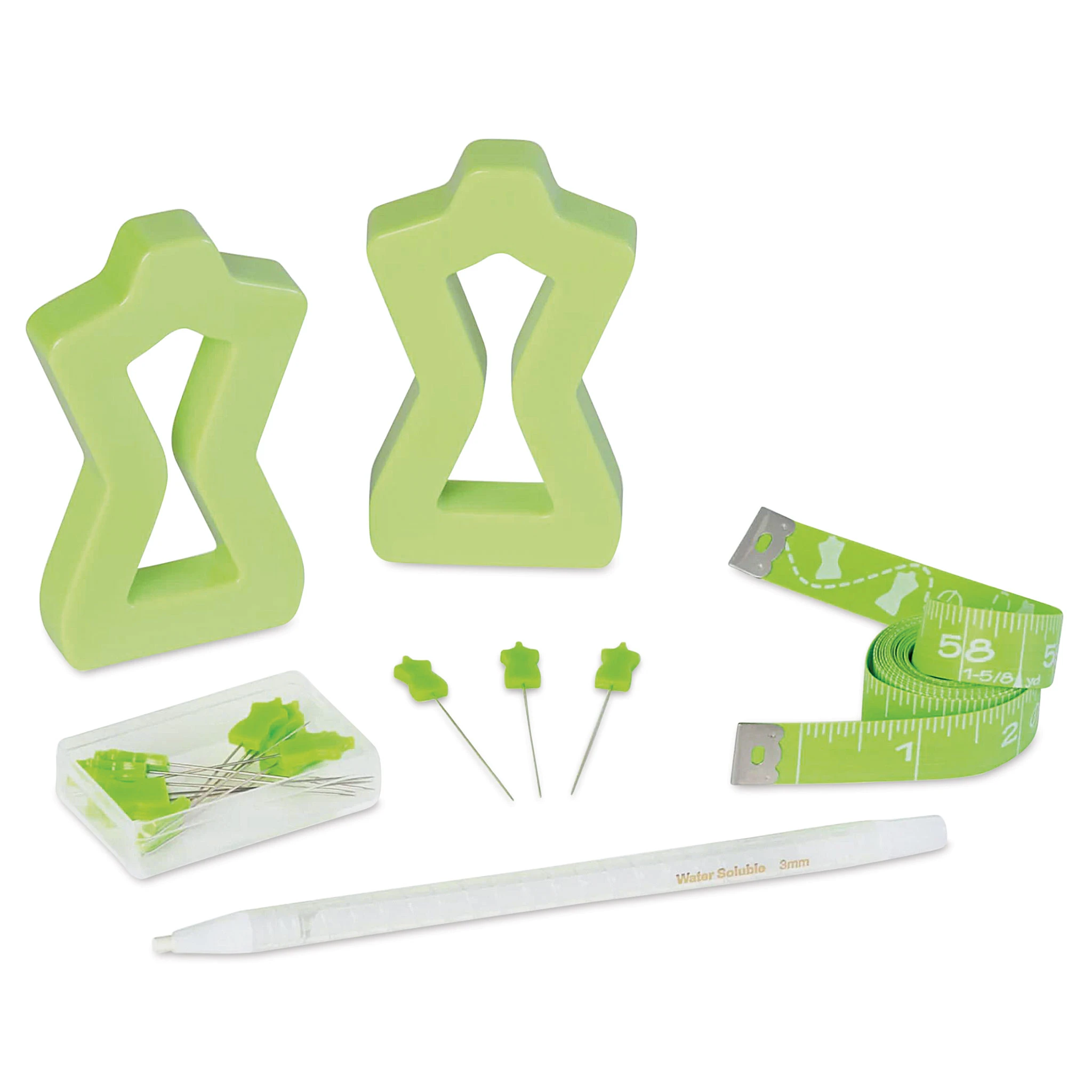 Take measurements, construct and transfer patterns, and more with the Dritz Pattern Layout Tool Set. This dress form-themed set features items that will help you complete all types of sewing projects, such as a tape measure, easy-to-grasp pins and weights for securing pattern pieces, and a watersolu…