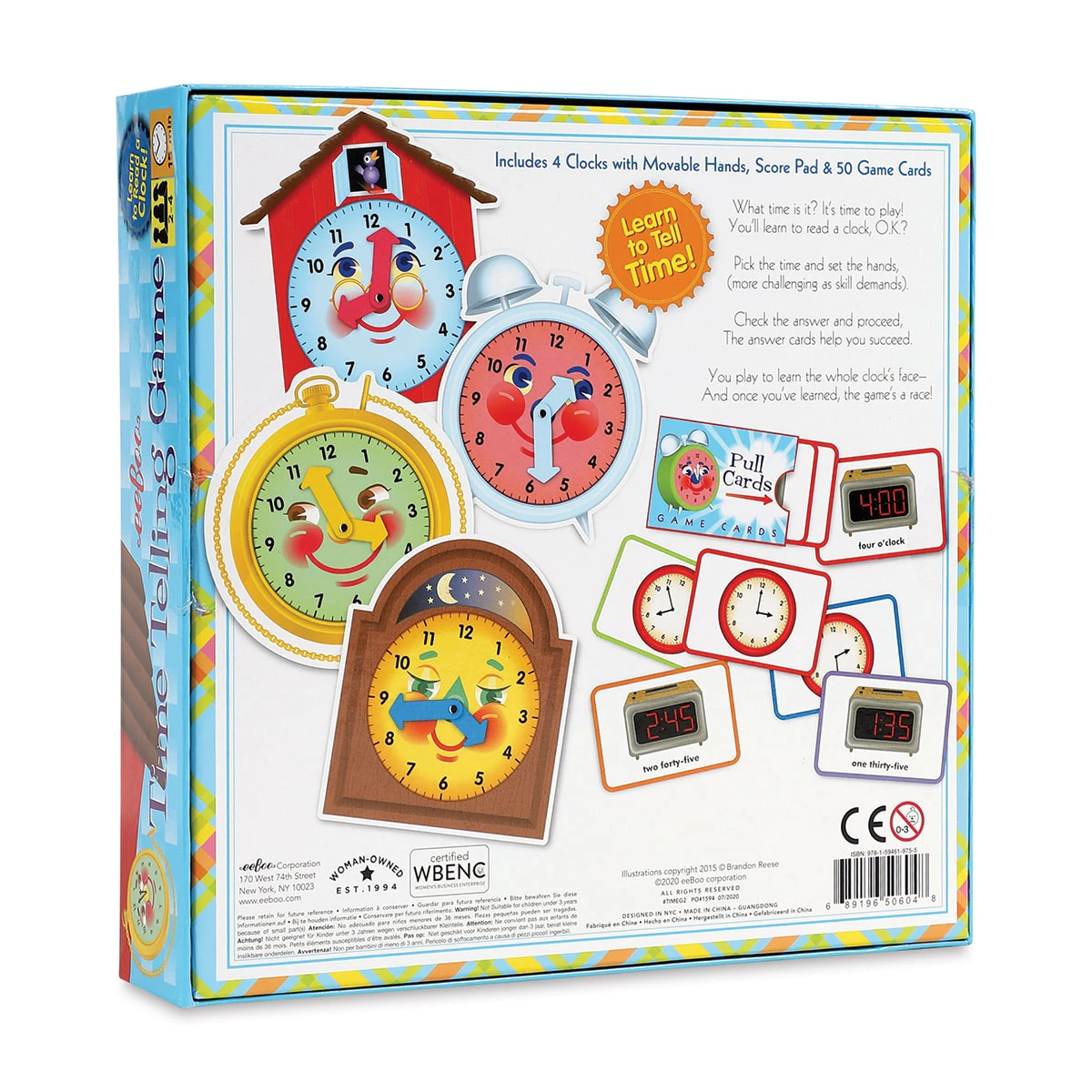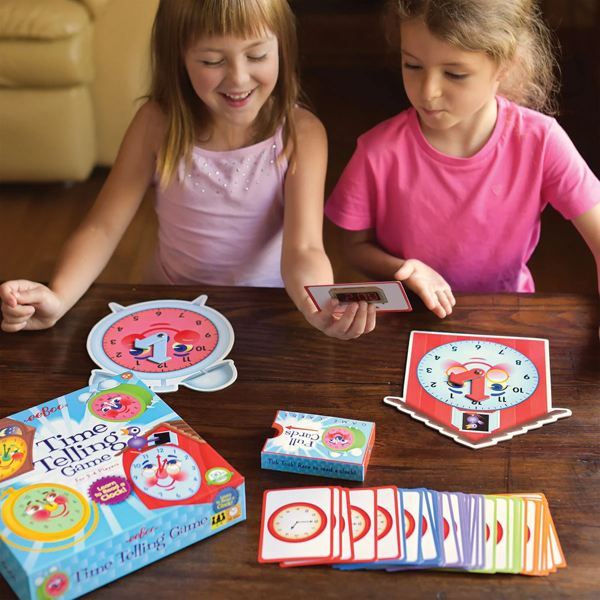 Learning to tell time can be a fun and interactive activity with the Eeboo Time Telling Game. A set of 50 cards describes various times on the clock, and players move the hands on their clock faces to match the description on each card. The cards are color-coded by difficulty, with each color repres…
