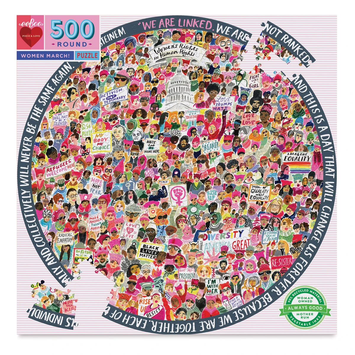 Commemorate the 2017 Women’s March on Washington by putting together the Eeboo Women’s March 500 Piece Puzzle. This round adult jigsaw puzzle has sturdy, glossy pieces and was designed by illustrator Jennifer Orkin Lewis. Measuring 23″ in diameter when complete, this puzzle features a quote by Glori…