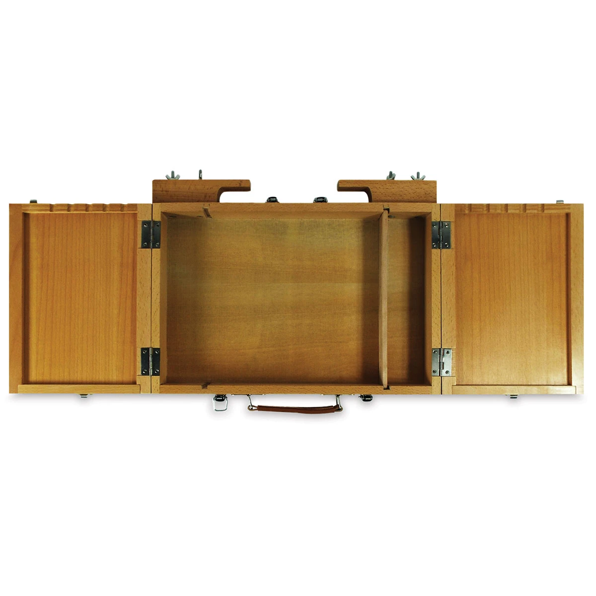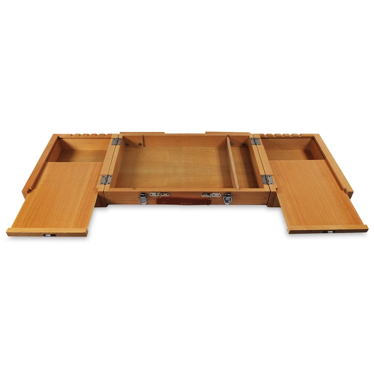 It provides lots of work and storage space when you’re painting out of the studio. There’s a large center area for your palette, two storage compa…