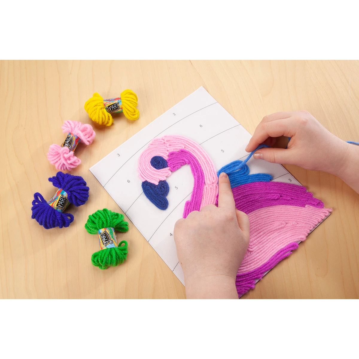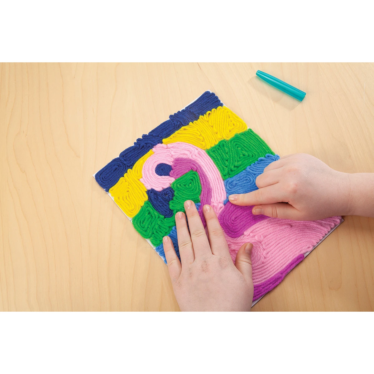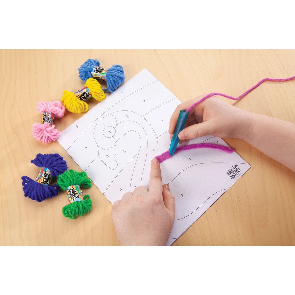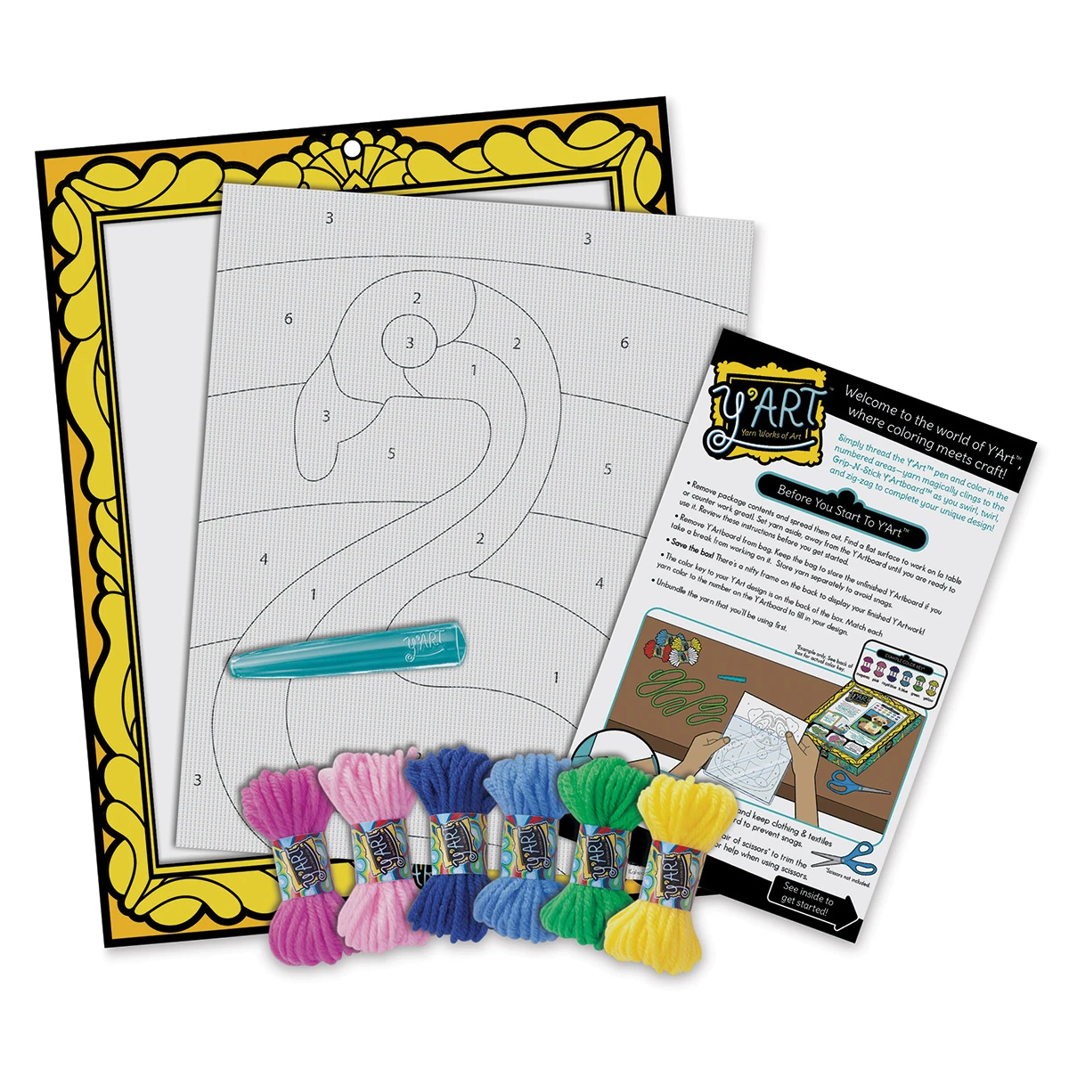 Insert yarn through the Y’Art pen, then swirl, twirl, and zig zag it onto the Grip-N-Stick…