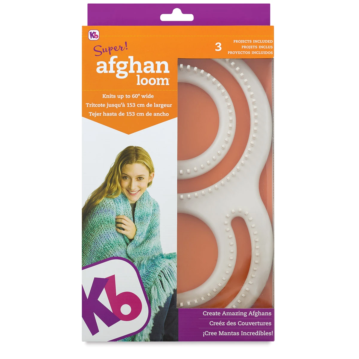 Knit a beautiful afghan or blanket in one piece with the KB Afghan Loom. This regular gauge, S-shaped loom knits up to 60″ (153 cm) wide, and its rounded construction and shape allow for many stitches without taking up much room. Start on your beginning peg and work around the loom, turning as you g…