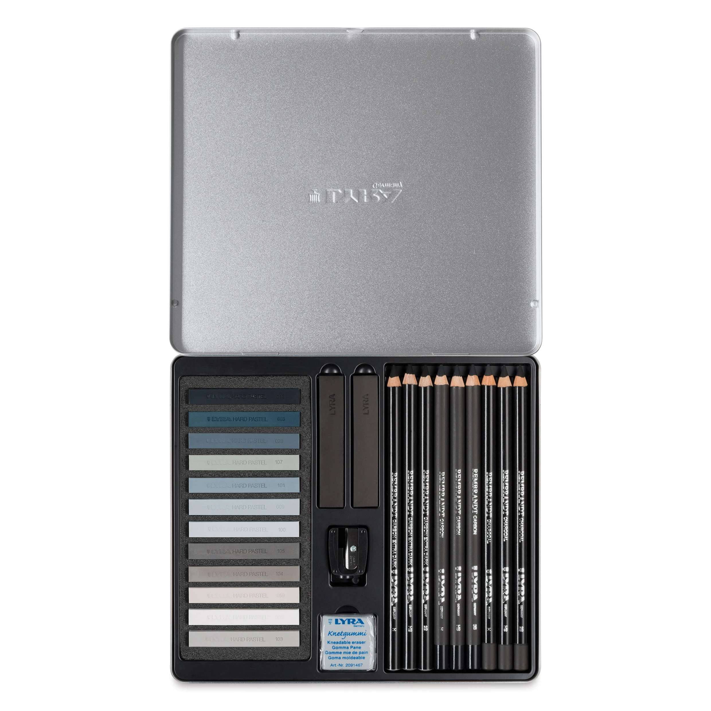 Create striking monochromatic work with the Lyra Grey Tones Sketching Set. Made in Germany, these sturdy pencils are made from 100% PEFC-certified cedar wood and contain extra-thick 5 mm lead. The 25-piece set contains a selection of charcoal, graphite, and carbon pencils, along with various grey-to…