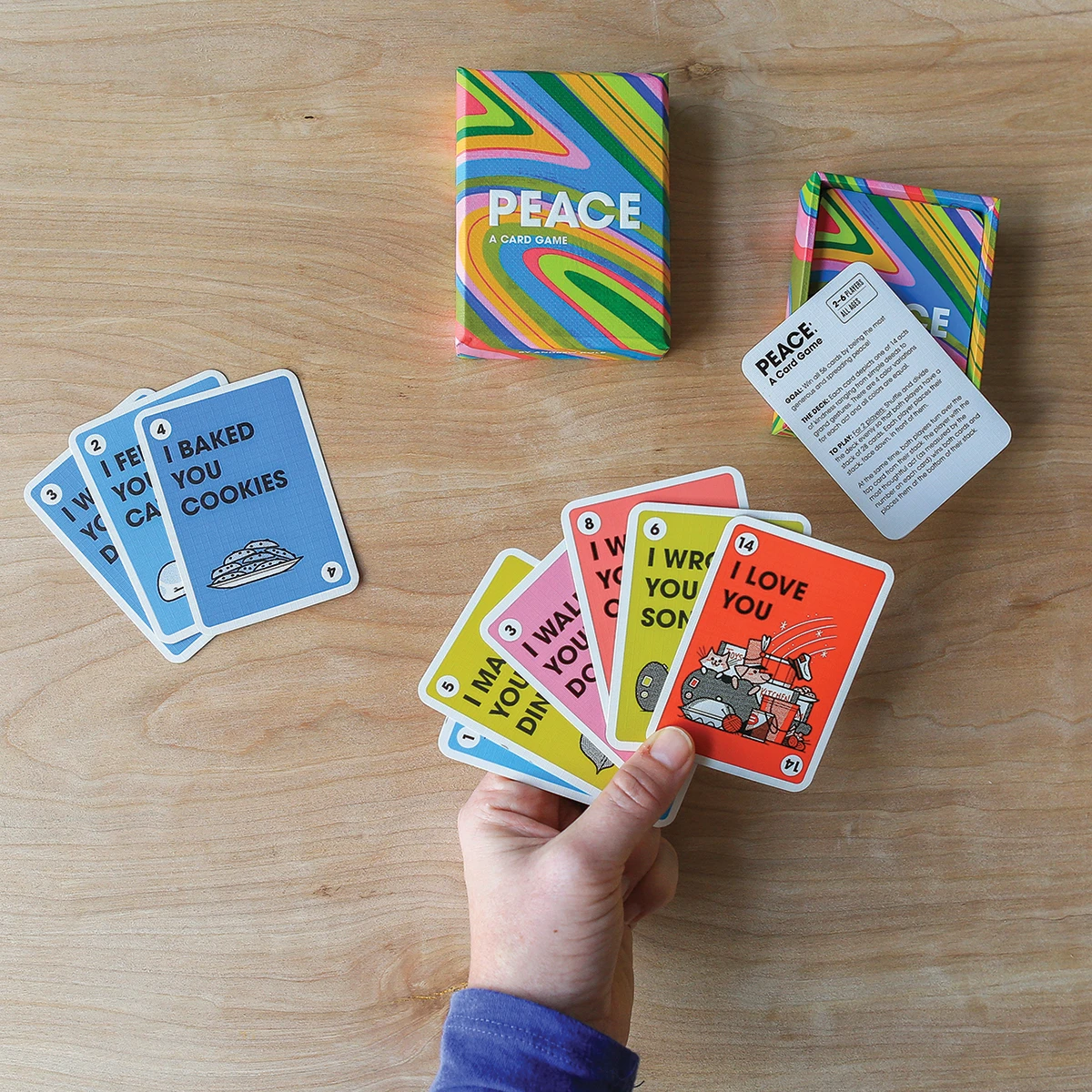 Peace: A Card Game is a playful and peace-loving take on the classic card game “war.” It encourages players to outdo one another with increasingly generous acts of kindness. Each card depicts a good deed, with the most thoughtful act winning the round. The cards feature charming vintage-inspired ill…