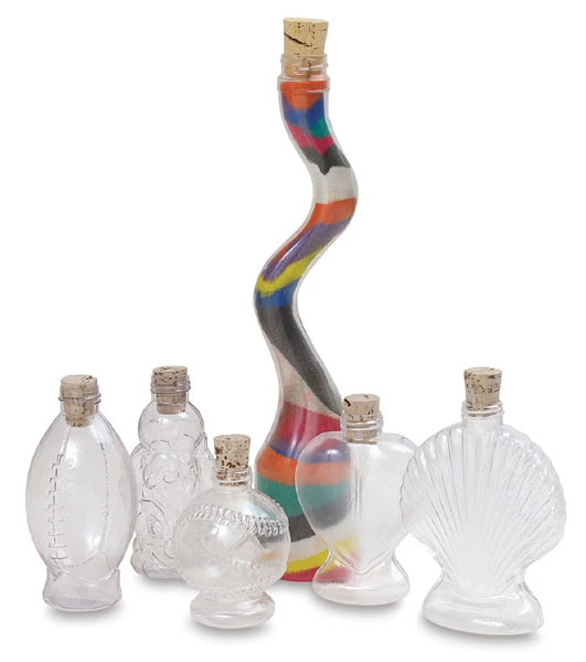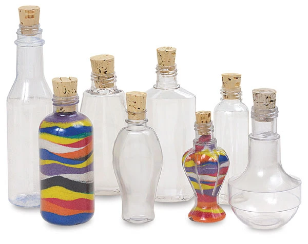Clear plastic bottles with natural cork stoppers. Fill with layers of colored sand for intriguing effects.