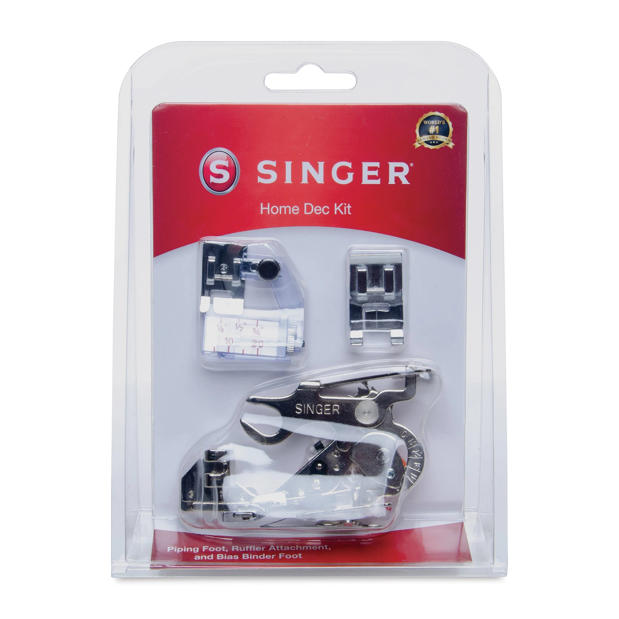 Create professional-looking home décor pieces for yourself or for friends and family members with the Singer Home Decor Presser Foot Kit. The piping foot creates a tailored finish by inserting packaged piping into seams and edges, the bias binder foot features an adjustable guide that works with tap…