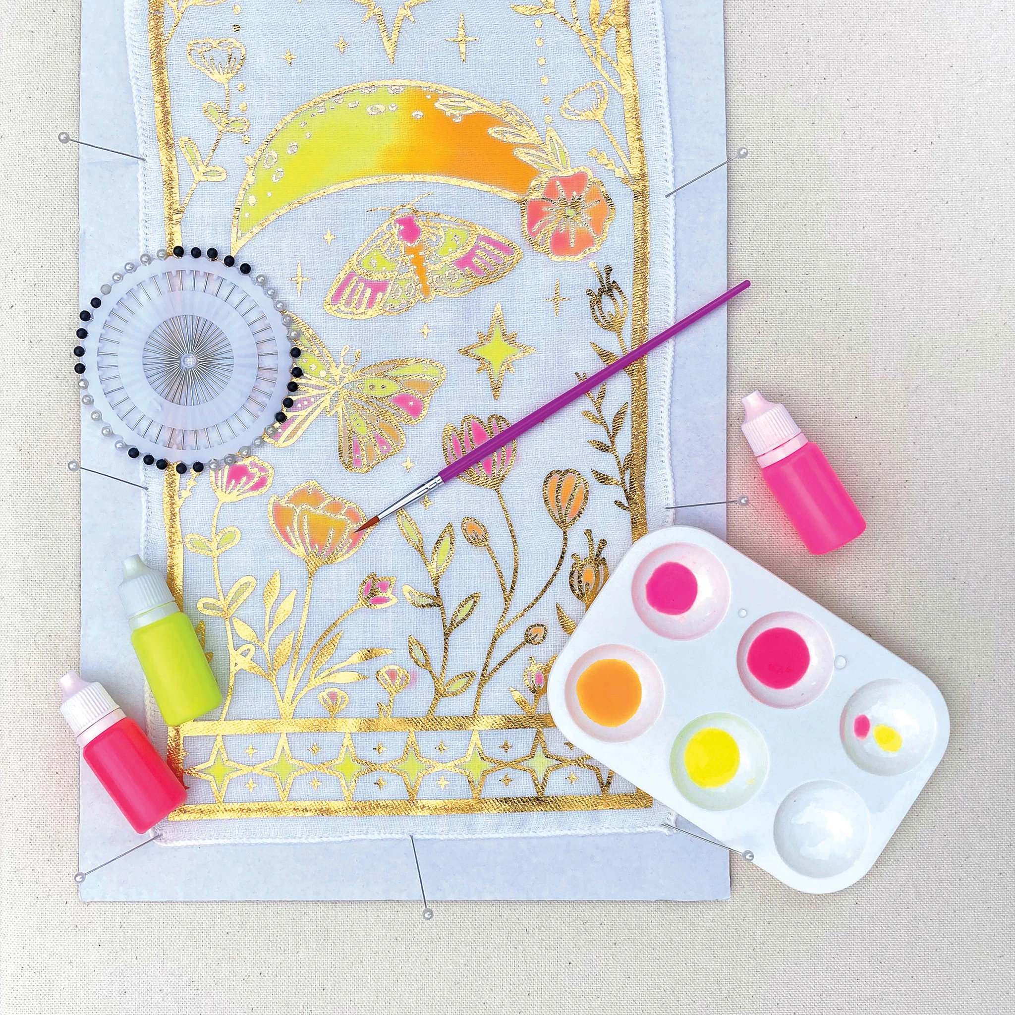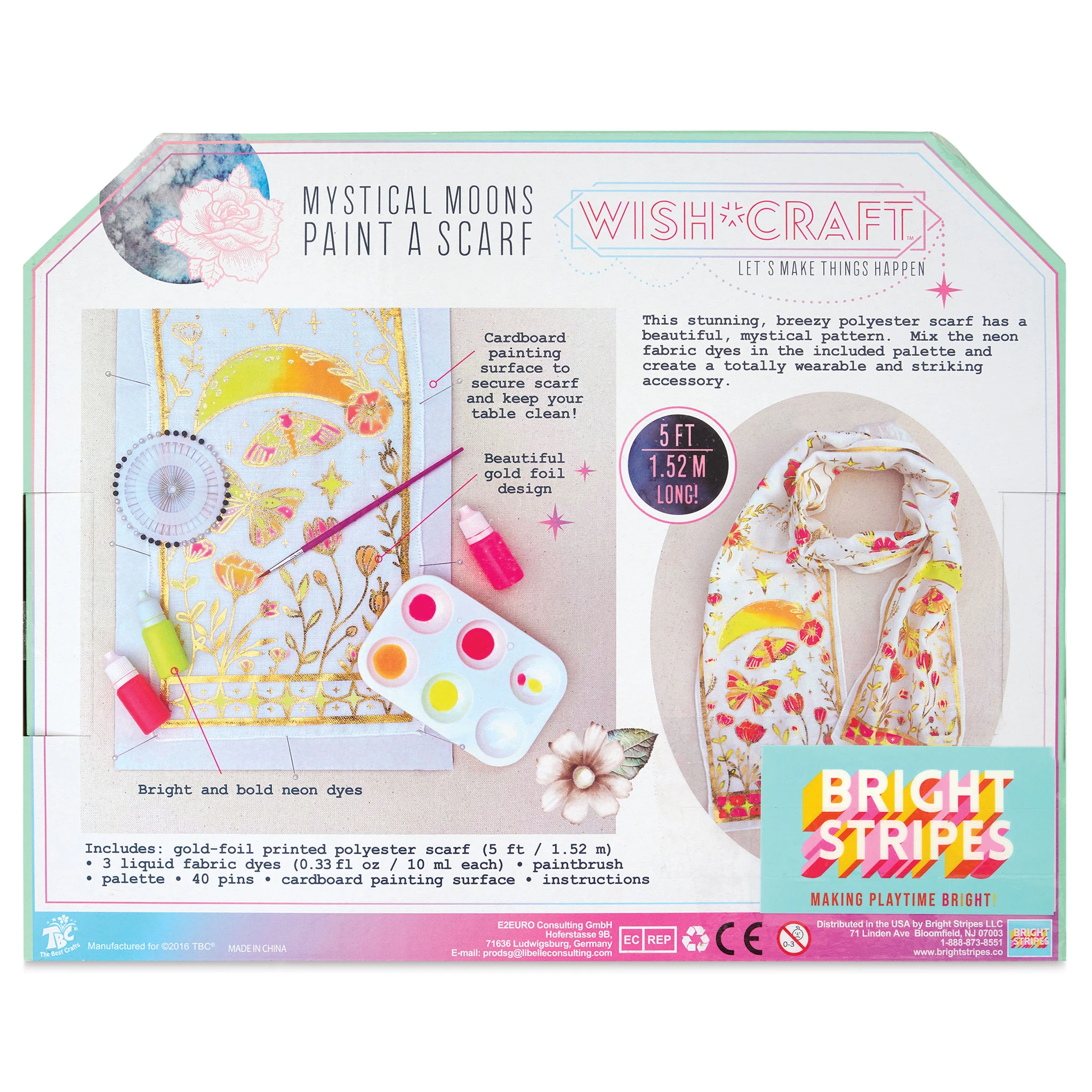Show off your creativity and sense of style with the WishCraft Mystical Moons Paint a Scarf Kit. Use the included fabric dye to fill in the pre-printed golden moon, moth, flower, and star designs on the scarf or add your own. Use your finished scarf as a fashion accessory or give it as a gift. The k…