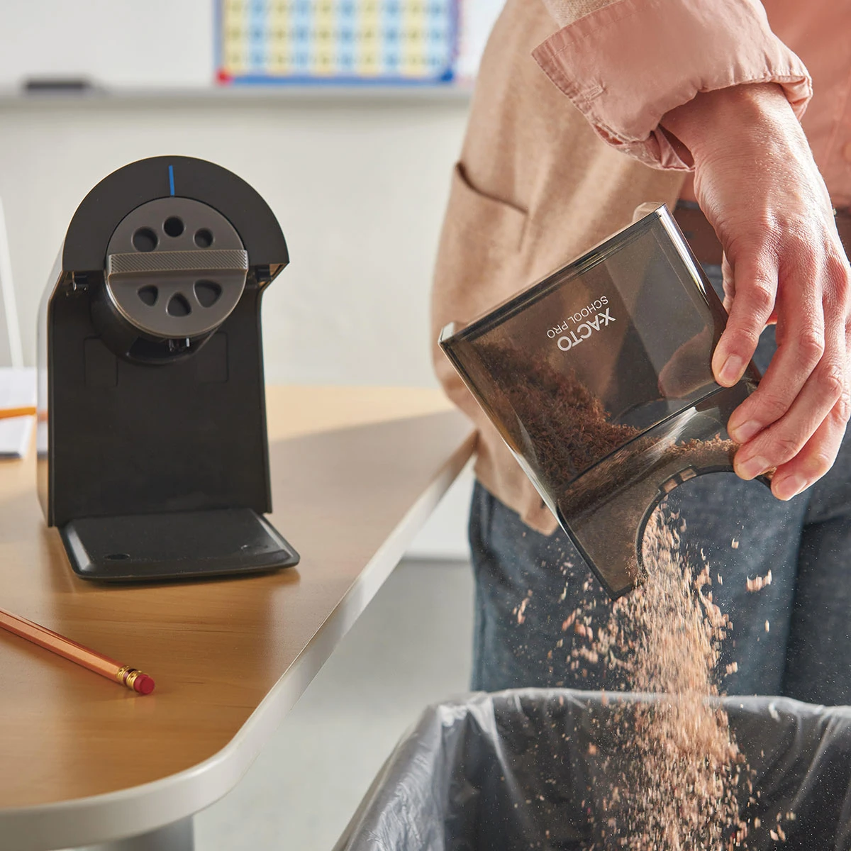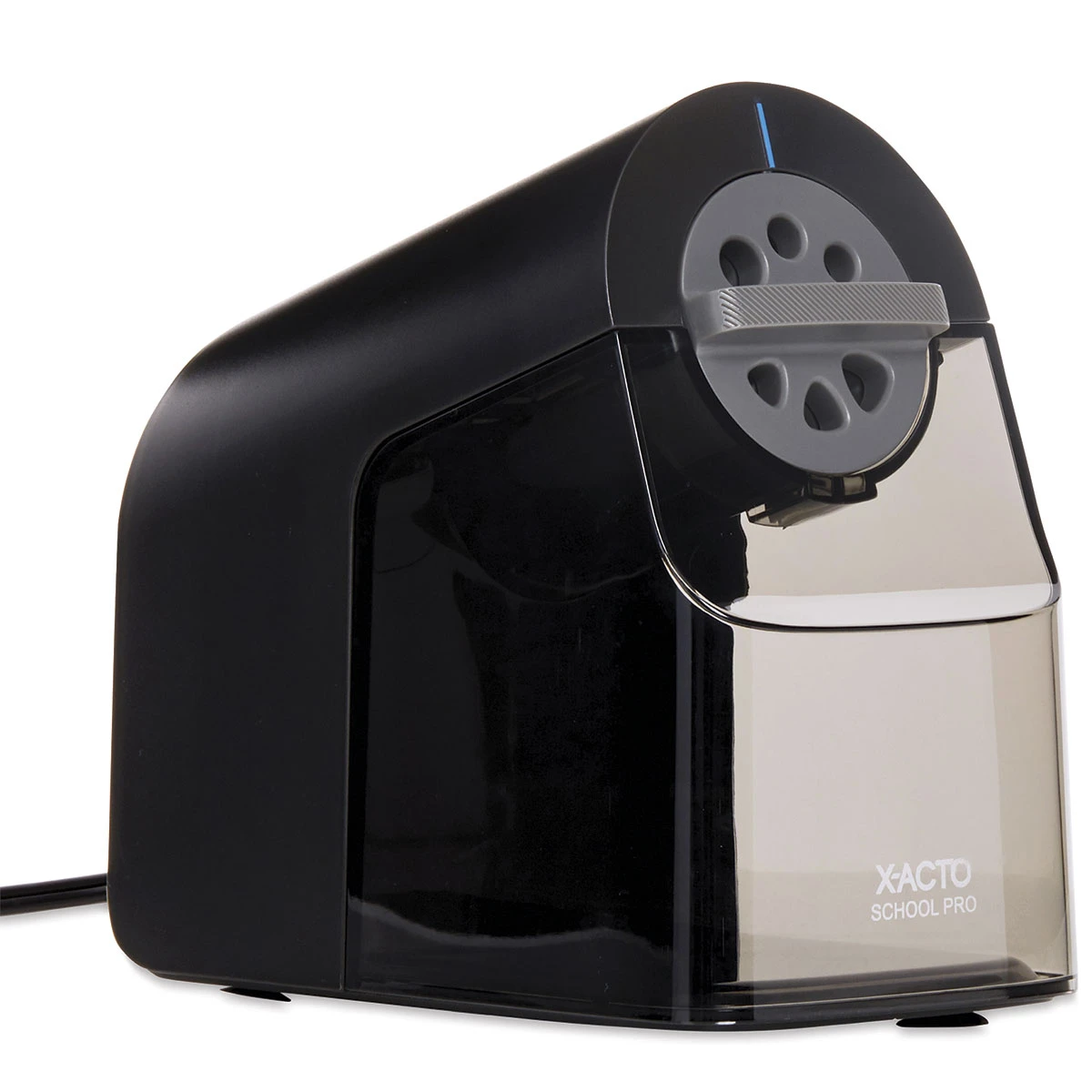 Versatile and easy to use, the X-Acto Pro Electric Pencil Sharpener is ideal for classrooms. It features a dial with six holes to fit most graphite or colored pencils. The sharpener’s printed indicator points to the size setting.